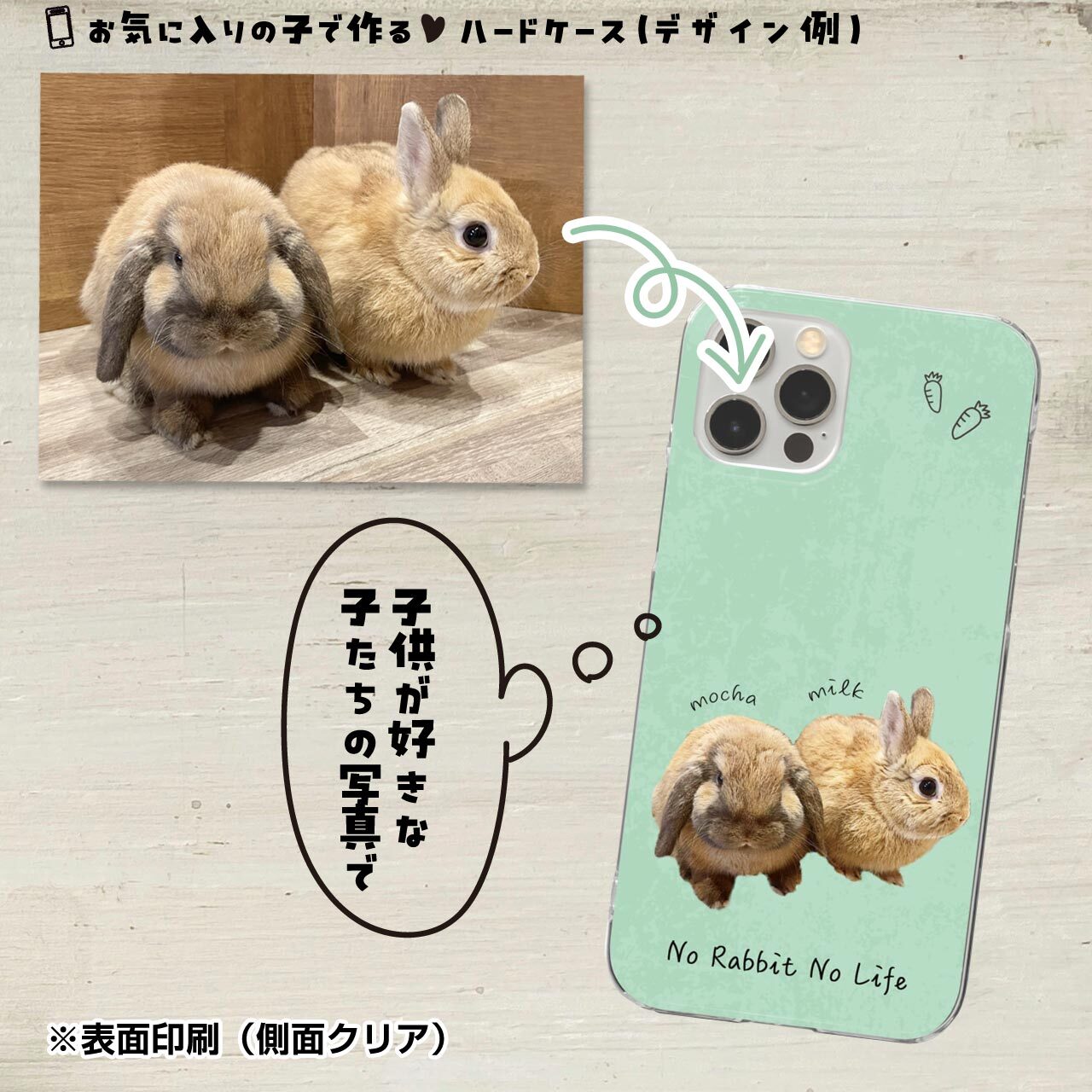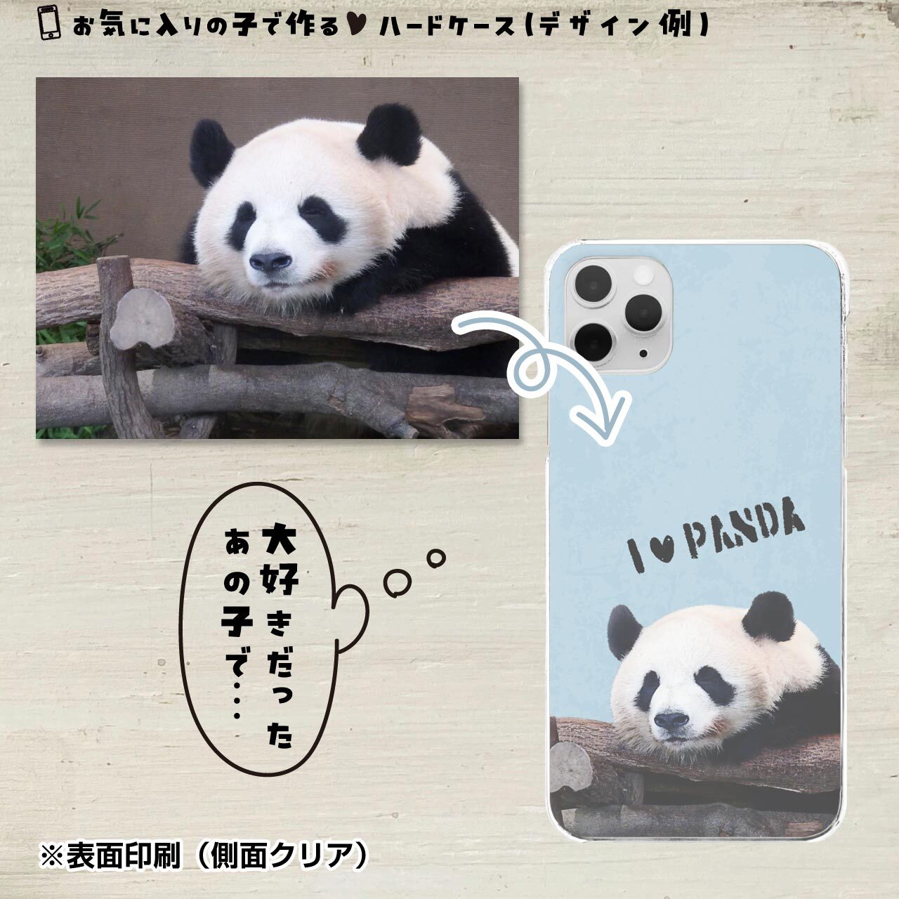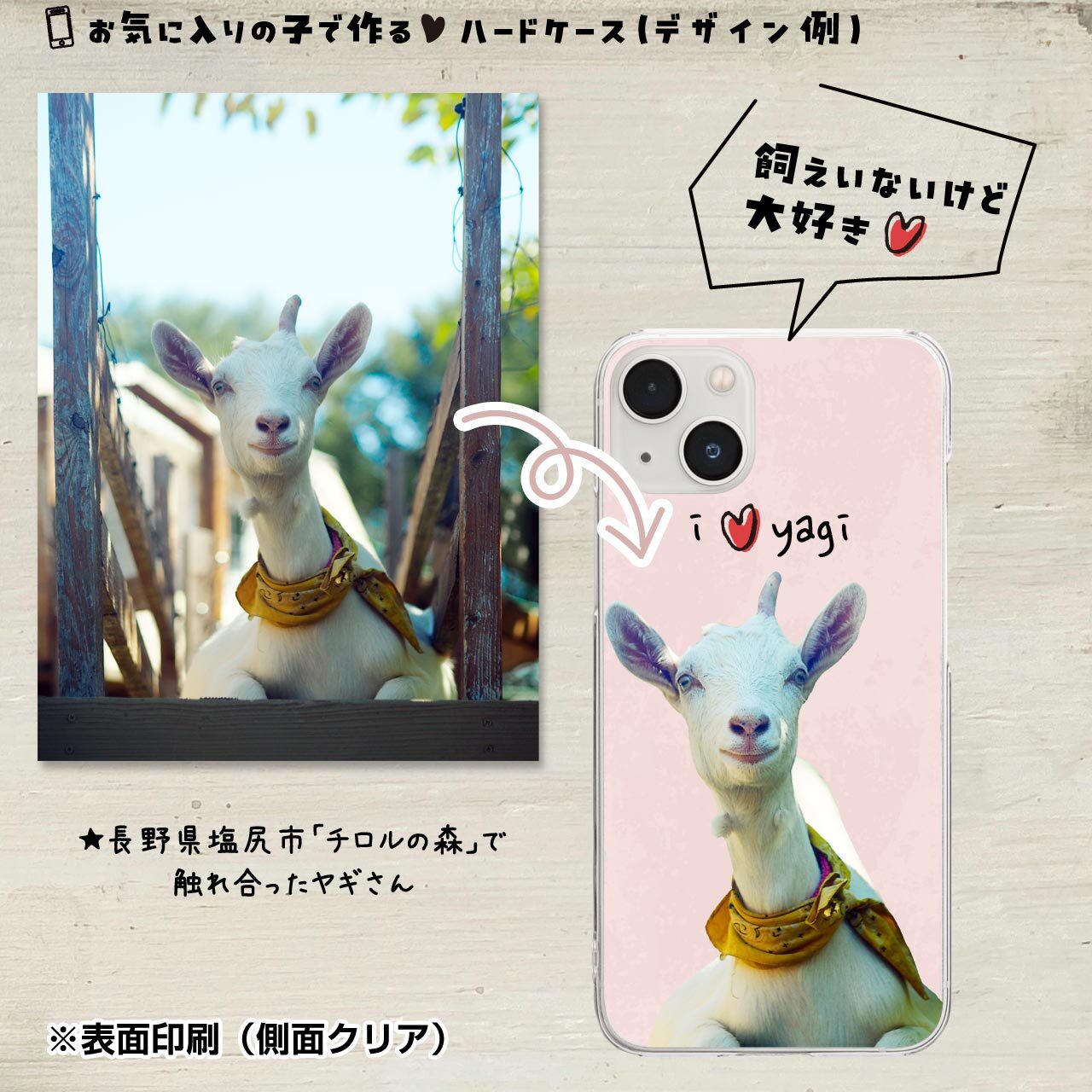 動物園でお気に入りのあの子、牧場やカフェで触れ合った子や、飼いたくても飼えない大好きな動物の写真でお作りできます!
